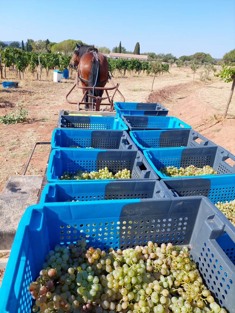 Les vendanges avec les chevaux c'est aussi possible ! En bout de rang ou dans les rangs nous chargeons les caisses et effectuons les transports jusqu'au chai